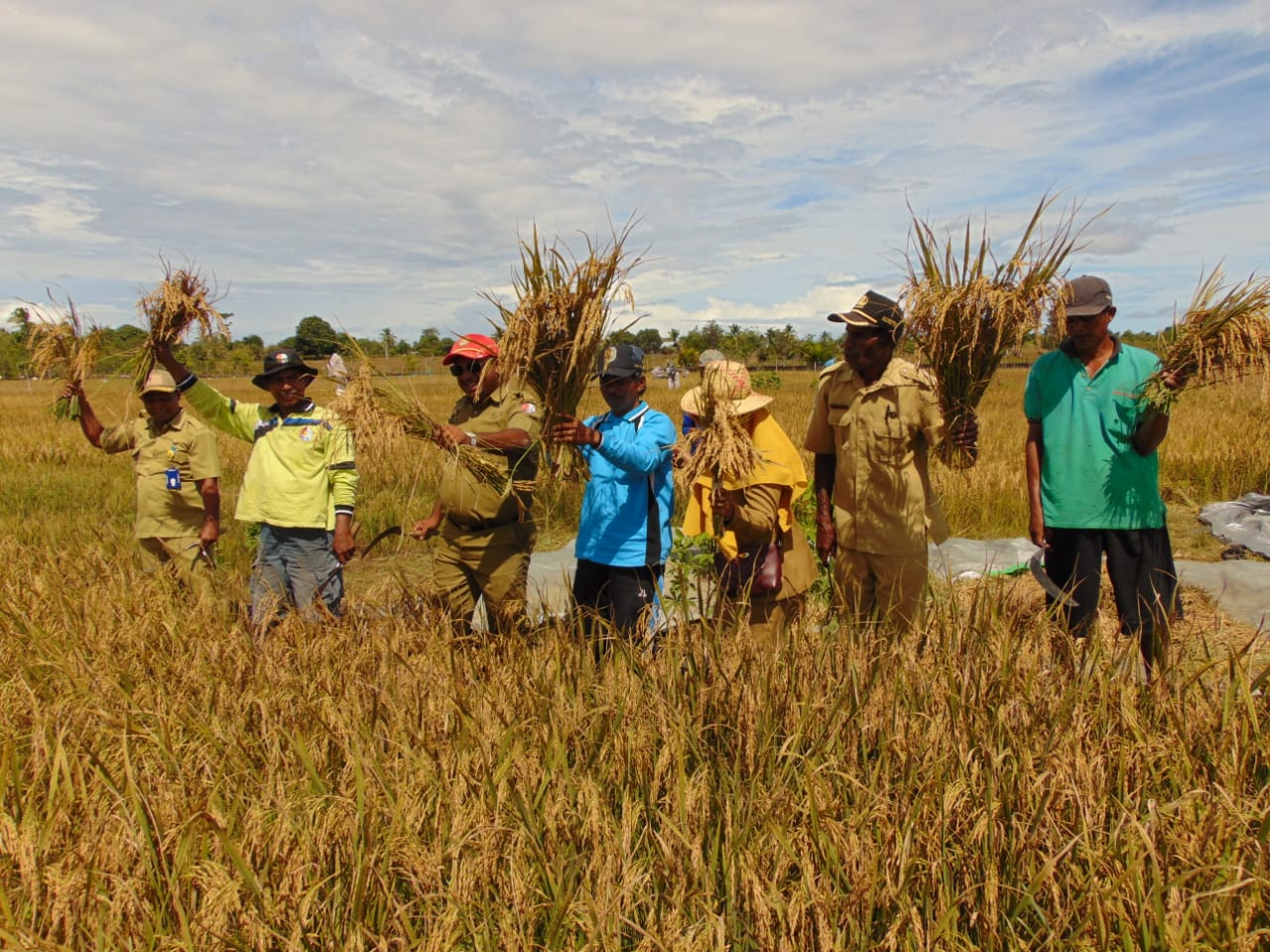 Ikut berpanas-panasan bersama petani, Plt.Kepala Distrik Bomberay serta Dinas Pertanian Kabupaten Fakfak dalam kegiatan panen padi bersama petani Distrik Bomberay di pematang sawah dengan luas lahan 5 hektar di kampung Pinang Agung, Rabu (19/02/2020).