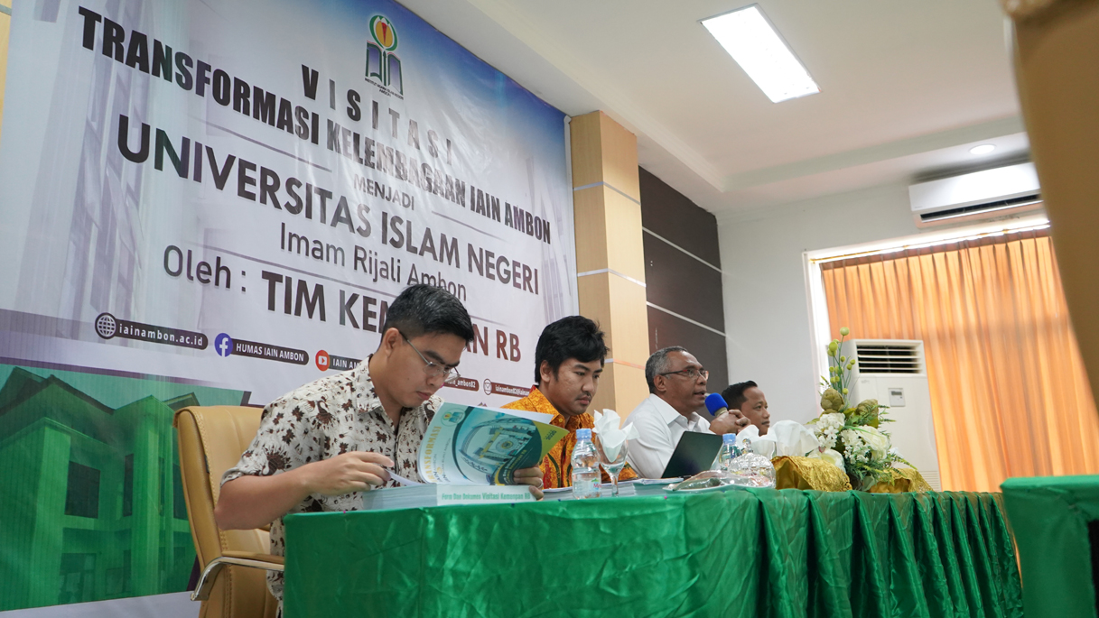 Sebelumnya, perwakilan Biro Ortala Kemenag RI, Hatta Aulia, yang tergabung dalam Tim Visitasi KemenpanRB menjelaskan, dari proses alih bentuk sembilan PTKIN yang lolos pada akhir tahun 2019 kemarin di Kemenag RI, baru tiga IAIN yang divisitasi oleh KemenpanRB. “Ini adalah IAIN ketiga yang dikunjungi Tim KemenpanRB. Pertama IAIN Surakarta, kedua, IAIN Purwokerto, dan ketiga IAIN Ambon ini.” Ia mengaku, sebelum ke IAIN Ambon, Tim Kemenag dan Tim MenpanRB sudah dua kali menggelar rapat, terkait dengan hasil kajian dokumen alih bentuk. “Memang, hasil kajian kami, ada beberapa data yang tidak singkron, baik antara hasil visitasi Kemenag RI, isi proposal maupun hasil pembahasan. Hal inilah yang perlu diklarifikasi, sehingga kami hari ini melakukan visitasi di IAIN Ambon.
