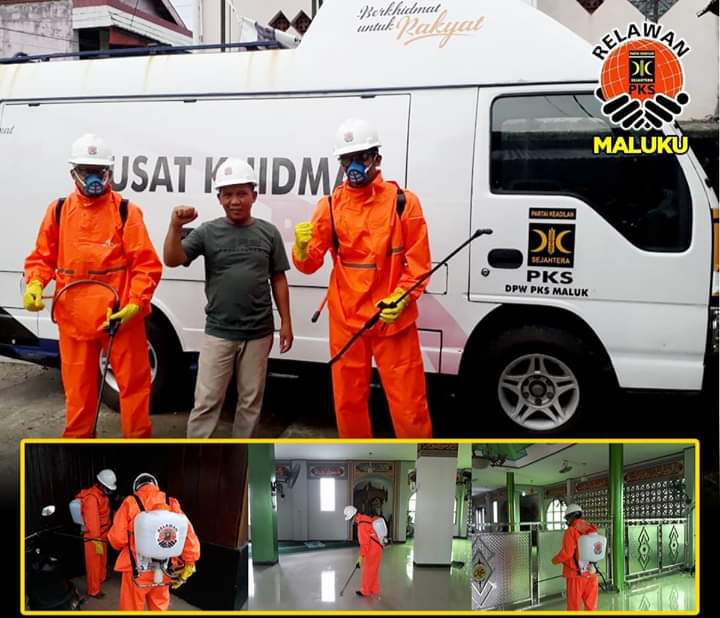 ” Giat perdana  hari ini. Penyemprotan desinfektan kita lakukan  di Mesjid Alfurqan Galunggung dan Mesjid Mujiburrahman Tanah Rata,” kata Indarto di sela-sela aktivitas penyemprotan desinfektan bersama Tim Genta PKS Maluku.