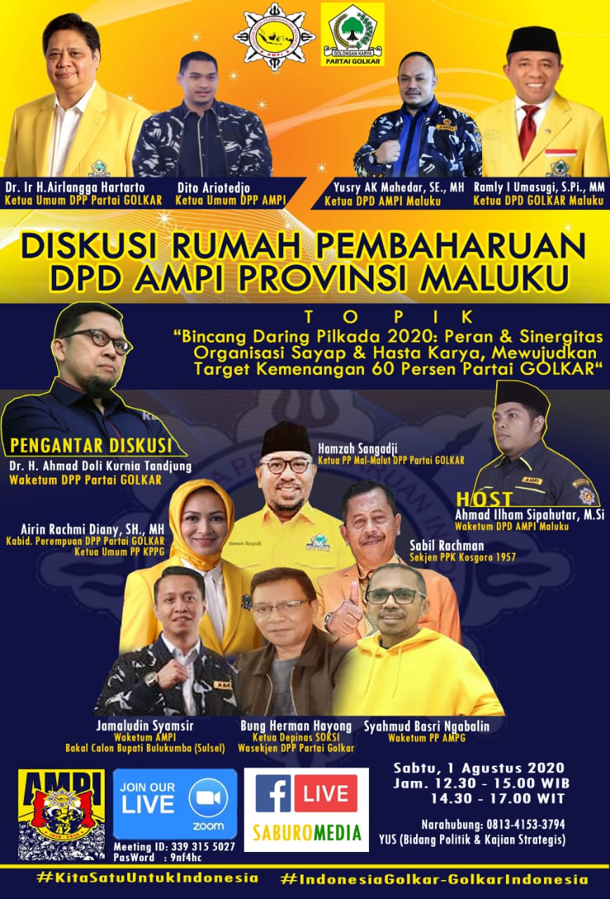 SABUROmedia, Ambon – Dewan Pimpinan Daerah (DPD) Angkatan Muda Pembaharuan Indonesia (AMPI) Provinsi Maluku, menggelar acara webinar dan bincang Pemilihan Kepala Daerah (Pilkada) 2020. Diskusi yang diselenggarakan oleh “Rumah Pembaharuan” DPD AMPI Maluku ini akan di buka pengantar diskusinya oleh Wakil Ketua Umum (Waketum) DPP Partai Golkar, Ahmad Doli Kurnia Tanjung.