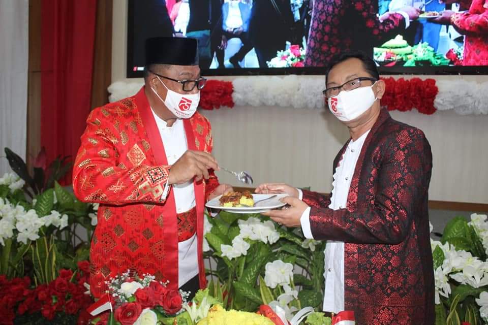 Usai upacara secara virtual acara pun dilanjutkan dengan syukuran HUT Kemerdekaan RI. Dikesempatan ini juga dilakukan pemotongan tumpeng oleh Gubernur Maluku dan doa bersama oleh Pimpinan Umat Beragama. (humasmaluku)
