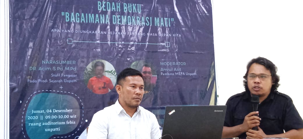 “ Buku Bagaimana Demokrasi mati” Adalah karya yang menghipnotis berbagai pemikiran antara Negara-negara bagian dan memiliki daya tarik jauh lebih besar dari pada politik yang hari ini terjadi,” Jelas Dr. Acim S.Pd M.Pd.dalam pemaparannya sebagai narasumber pada acara bedah buku yang digelar Mahasiswa Ekonomi Pencinta Alam (MEPA) Unpatti Ambon, Jumat (04/12/2020).