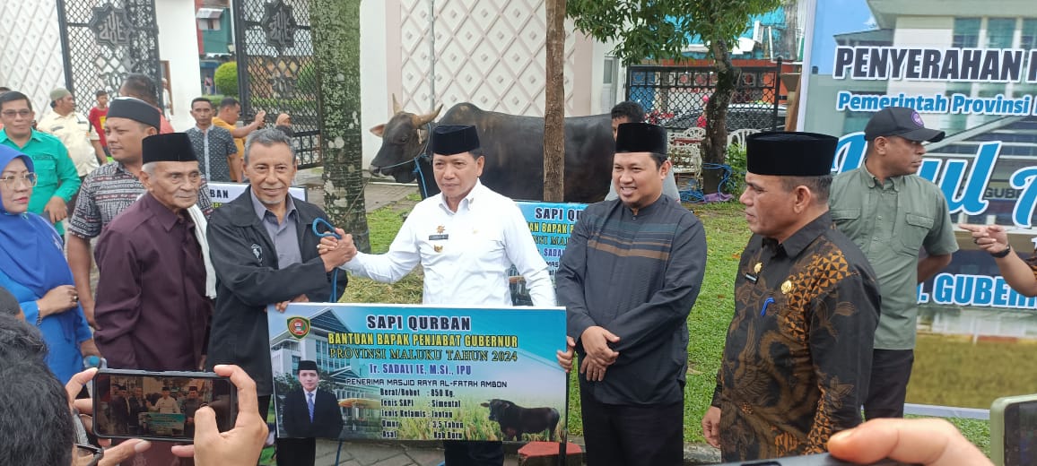 AMBON- Menjelang Perayaan Hari Raya Idul Adha 1445 H/2024 M, Penjabat (Pj) Gubernur Maluku, Sadali Ie, menyerahkan secara simbolis dua hewan kurban kepada pihak Yayasan Masjid Al-Fatah Ambon, Kamis (13/06/2024).