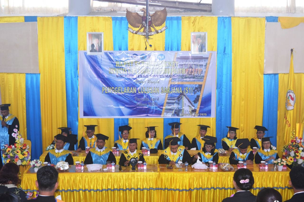 Penggelaran yudisium ini dilaksanakan mengacu pada Surat Keputusan Dekan Fakultas Ilmu Sosial dan Ilmu Politik Universitas Pattimura Nomor : 63/UN13.1.2/SK/2025 Tentang Pengukuhan Dan Penggelaran Lulusa Sarjana (S1) Fakultas Ilmu Sosial dan Ilmu Politik Universitas Pattimura Periode April 2025.