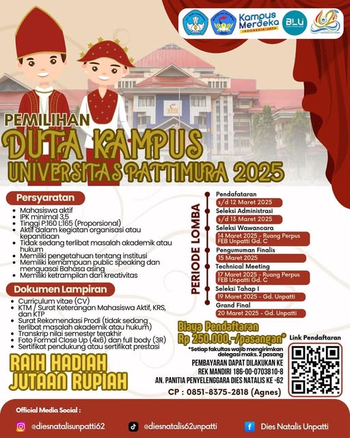 SABUROmedia, Ambon – Universitas Pattimura Ambon untuk pertama kalinya menggelar ajang Pemilihan Duta Kampus 2025.