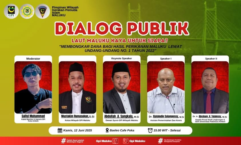 Dialog Publik ini sendiri mengangkat tema ” Membongkar Dana Bagi Hasil Perikanan Maluku ” yang di kaji melalui Undang – Undang No. 1 Tahun 2022.