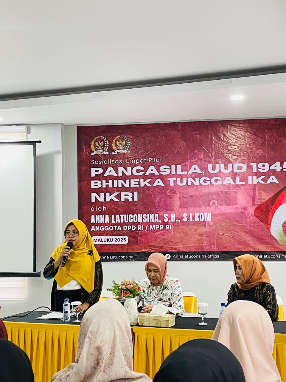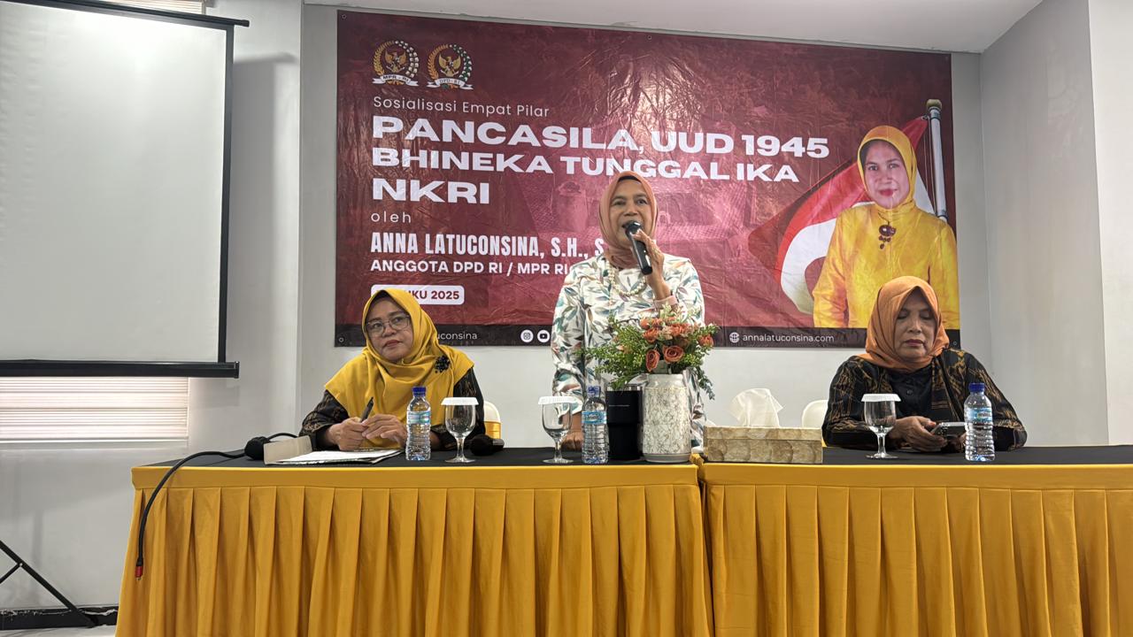 SABUROmedia, Ambon – Lembaga Perempuan Maluku Berkarya menggandeng Anna Latuconsina., SH., S.I.Kom, Senator DPD RI asal Daerah Pemilihan Provinsi Maluku dalam kegiatan Sosialisasi Empat Pilar Kebangsaan di Hotel Grand Avira Ambon, Selasa (23/12/2025)