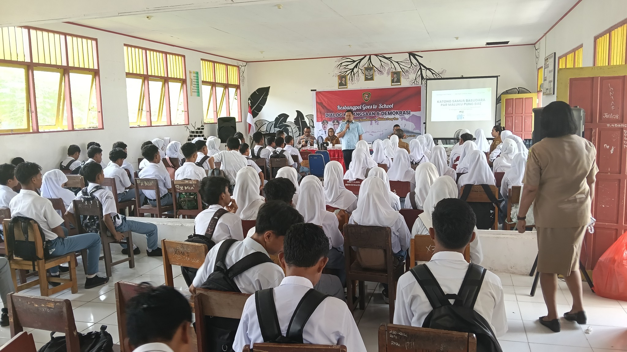 Hadir bersama Kepala Kesbangpol Maluku, Daniel E. Indey., S.Sos., M.Si, Kepala Sekolah Raudhia Abdurrahman., S.P bersama Dewan Guru, serta ratusan siswa-siswi SMA Negeri 22 Malteng.